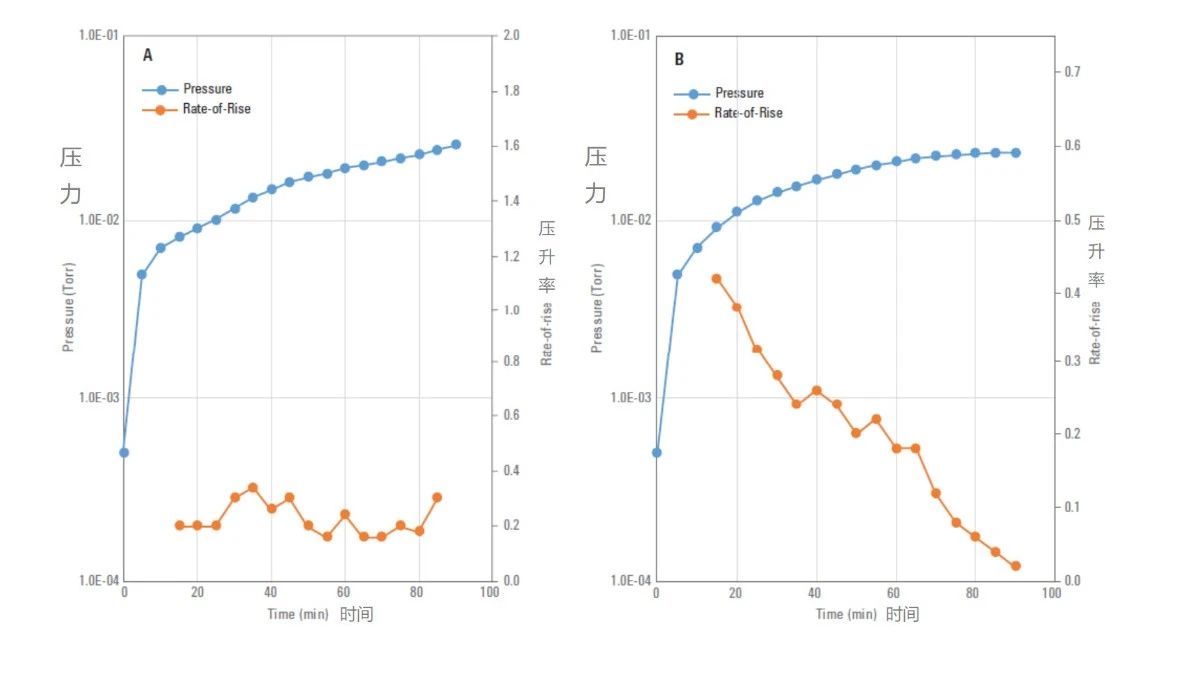 如上圖中的系統(tǒng)A,如果多次測量的壓升率基本恒定不變,那么很可能系統(tǒng)有真實(shí)的泄漏。對(duì)應(yīng)的,如上圖中的系統(tǒng)B,隨著時(shí)間的推移,其壓升率下降,即系統(tǒng)壓力的增加速度會(huì)隨著時(shí)間的推移而減慢,則暗示有虛漏或放氣(可能也有小的泄漏)。